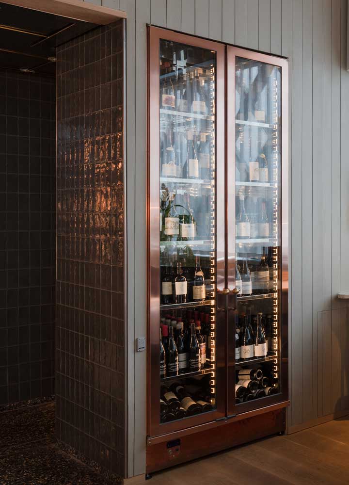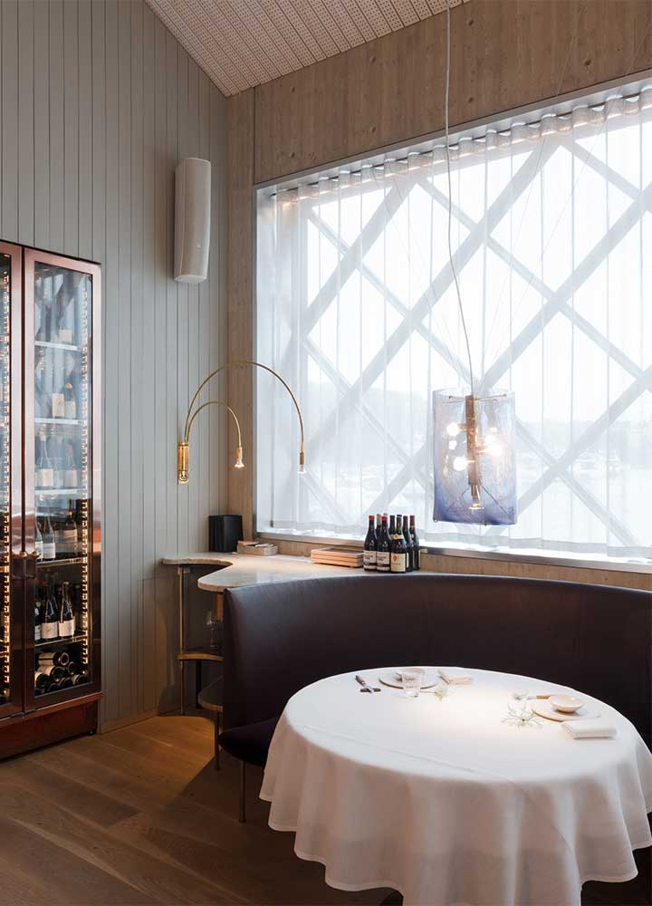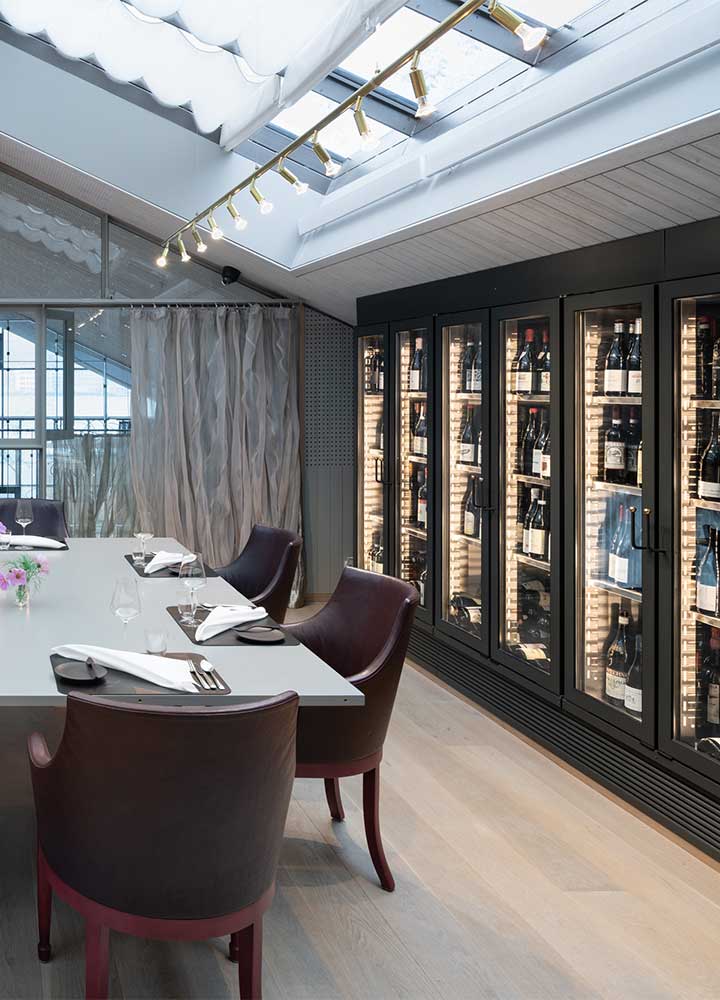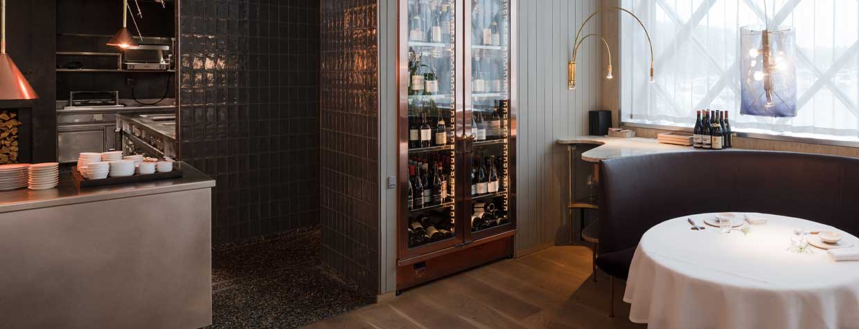 Restaurang AIRA på Biskopsudden i Stockholm drivs av stjärnkocken Tommy Myllymäki. Här har vi levererat och monterat specialbyggda vinmontrar från Haglund Industri. Foto: Lasse Olsson