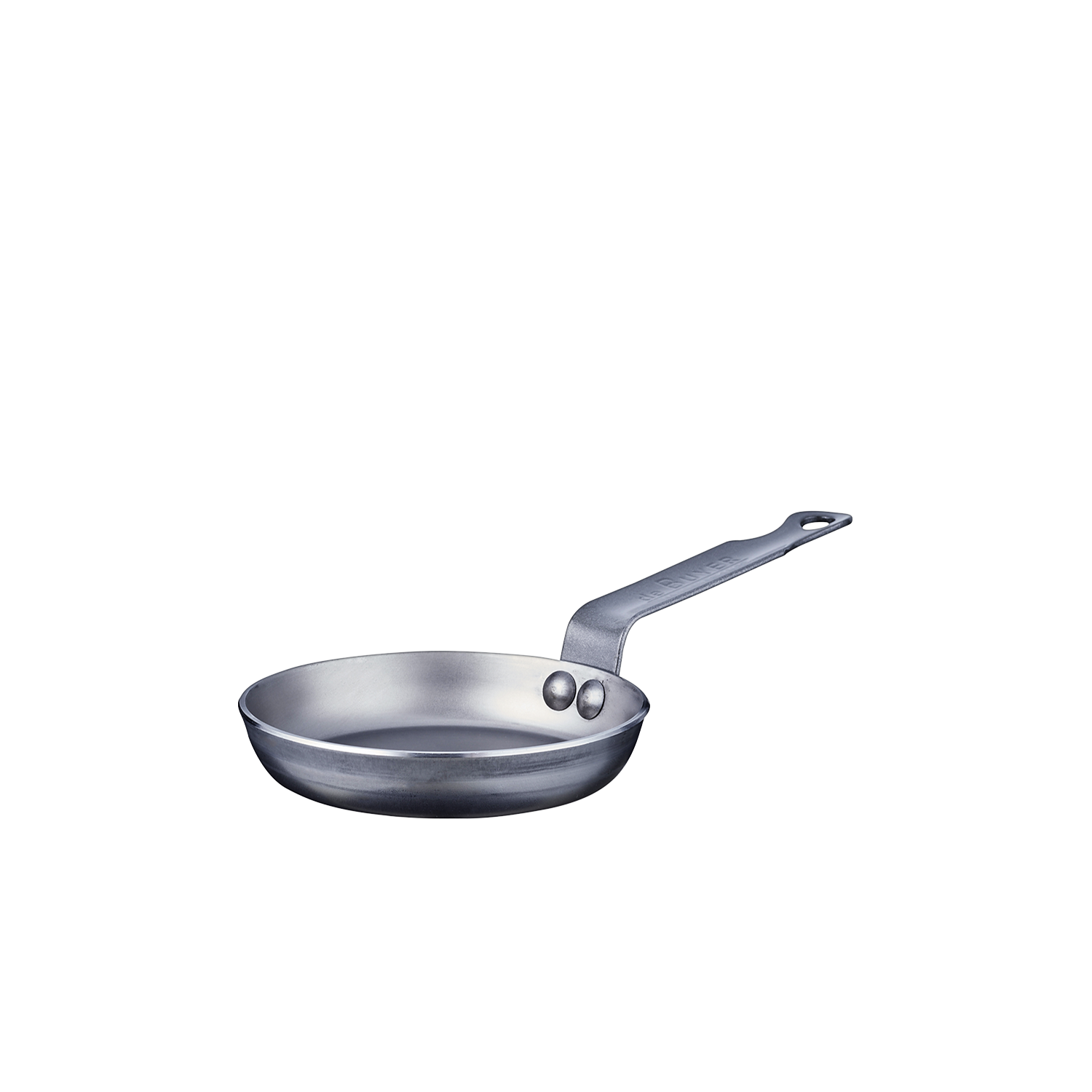 Liten blinipanna i kolstål från franska De Buyer. Materialet i pannan ger en snabb och jämn värmespridning vilket är en fördel när du gör potatis och äggrätter. En kolstålspanna måste stekas in. Desto mer den används ju mörkare blir den, ytan mättas och kolstålet får en naturlig non-stick egenskap. De Buyer Mineral fungerar på alla spishällar. De ska diskas för hand och därefter torkas torra. Kolstål rostar om de ligger blöta länge och de får aldrig diskas i maskin.