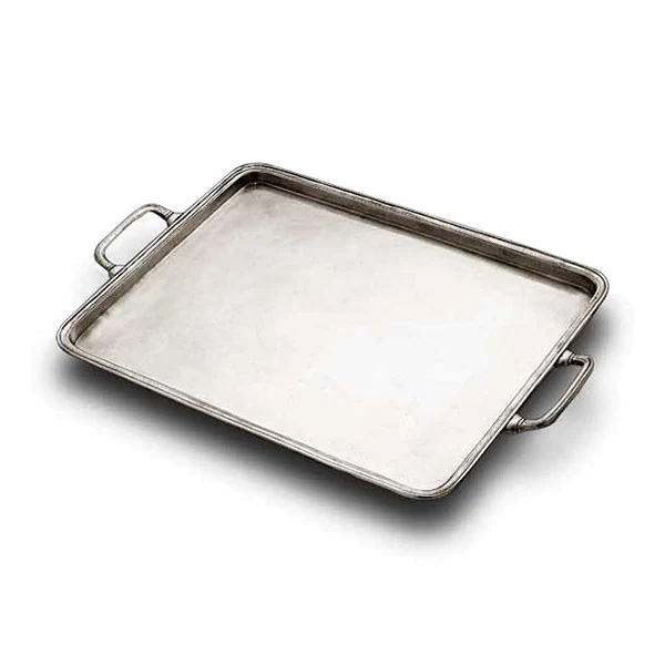 Rektangulär bricka med handtag 38x31cm. Tillverkad för hand i tenn av Italienska tenntillverkare sedan 1954.