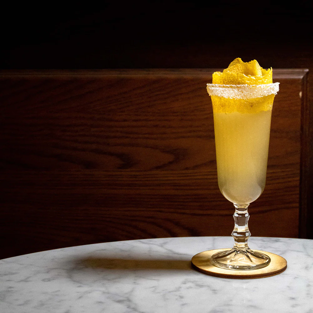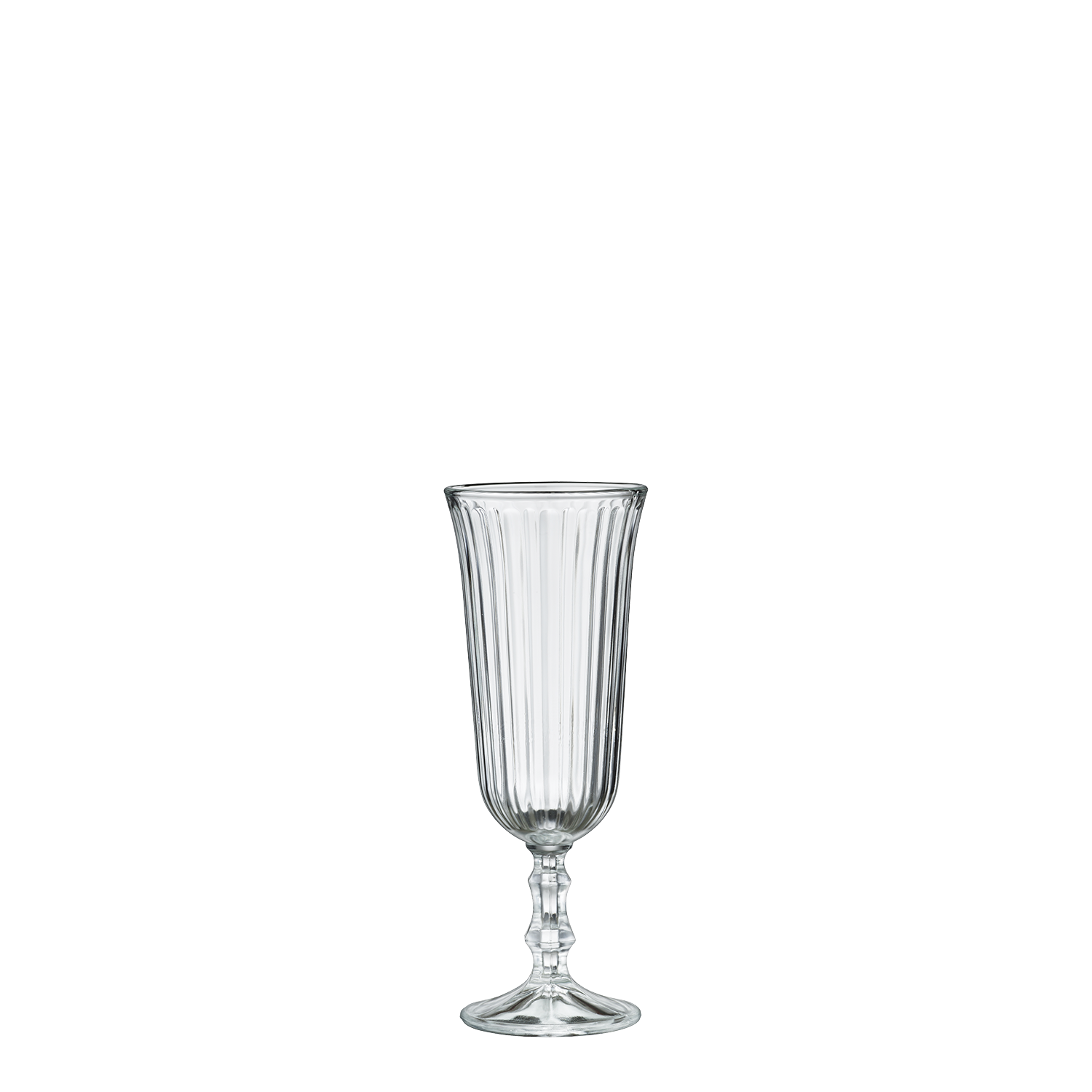 Champagneglas i serien Belem från den amerikanska glastillverkaren Libbey. Belem är ett hållbart glas tillverkat i blyfri kristall. Glaset är i retrostil med en design inspirerad av det eleganta 20-talet. Kupan har ett dekorativt mönster med inetsade ränder och benet har ett fint kristallslipat mönster.