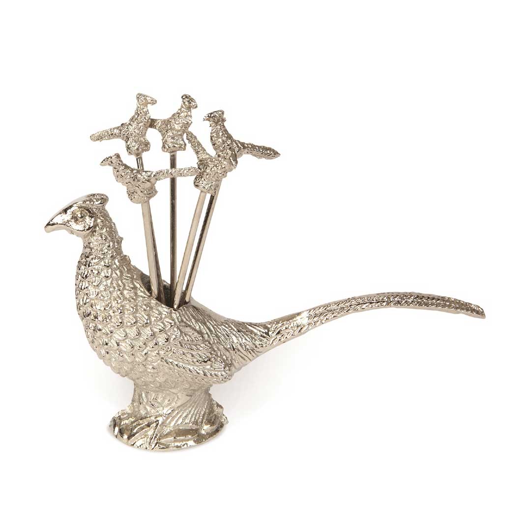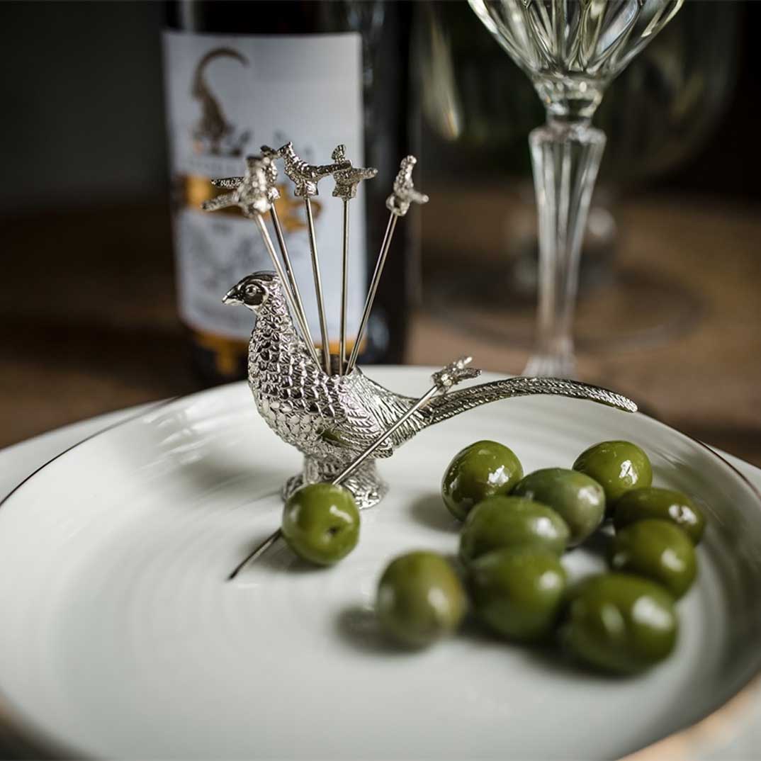Sex cocktailpinnar i en fasanhållare – var och en toppad med en fasan i miniatyr. Perfekt till servering av oliver och smårätter.