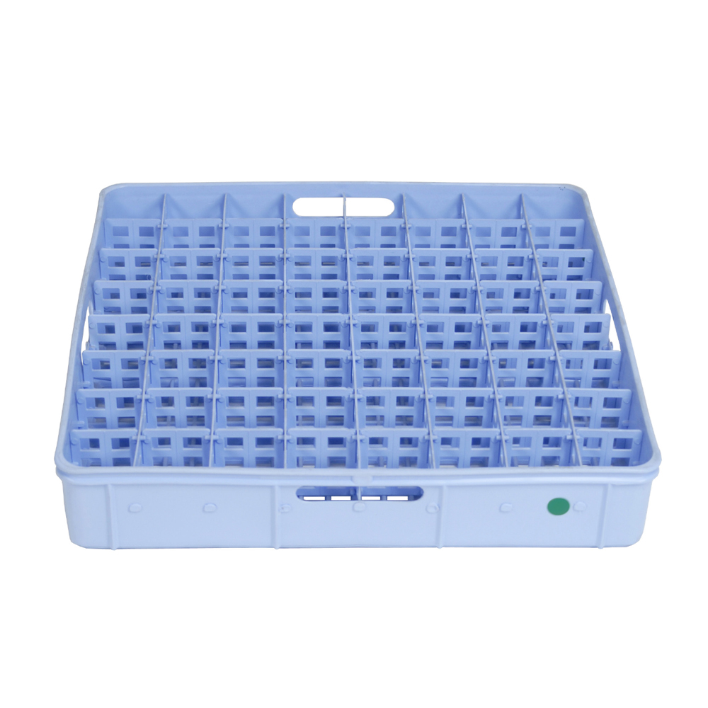 Fackinsats för glas, 46×46 cm. 64 glas med max diameter 52 mm. Vid diskning placeras korgen i en 50 cm korg.