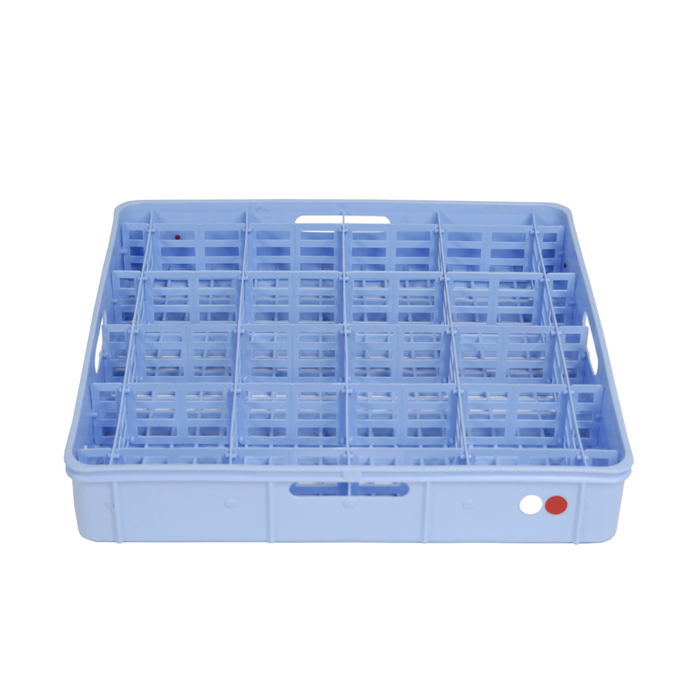 Fackinsats för glas, 46×46 cm. 16 glas med max diameter 95 mm. Vid diskning placeras korgen i en 50 cm korg.
