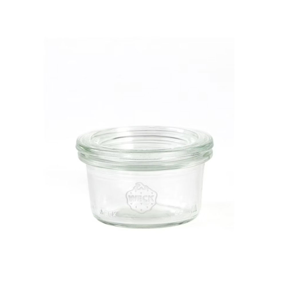 Liten glasburk utan lock från Weck, rymmer 50 ml.
