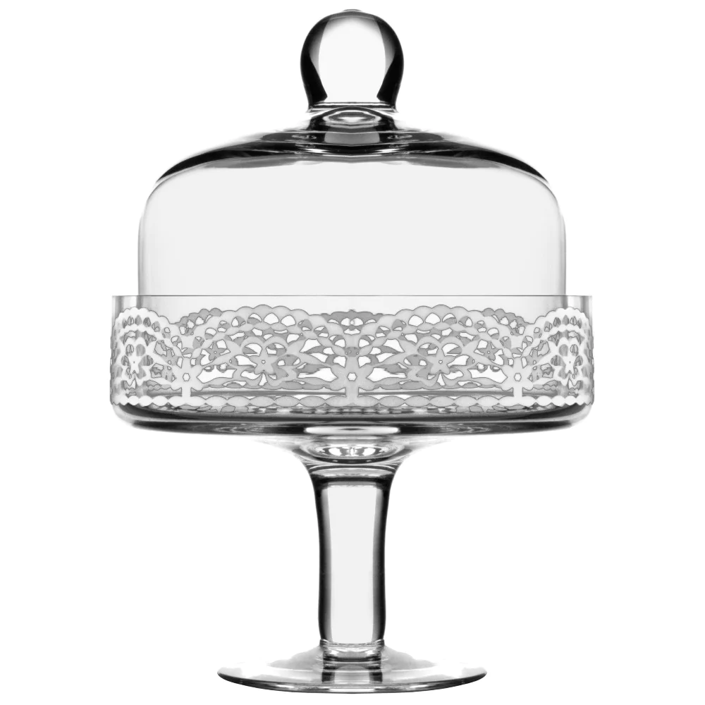 Ett dekorativt och snyggt kakfat i glas med högt ben och stadig fot. En utmärkt kombination av funktionalitet och elegans.
