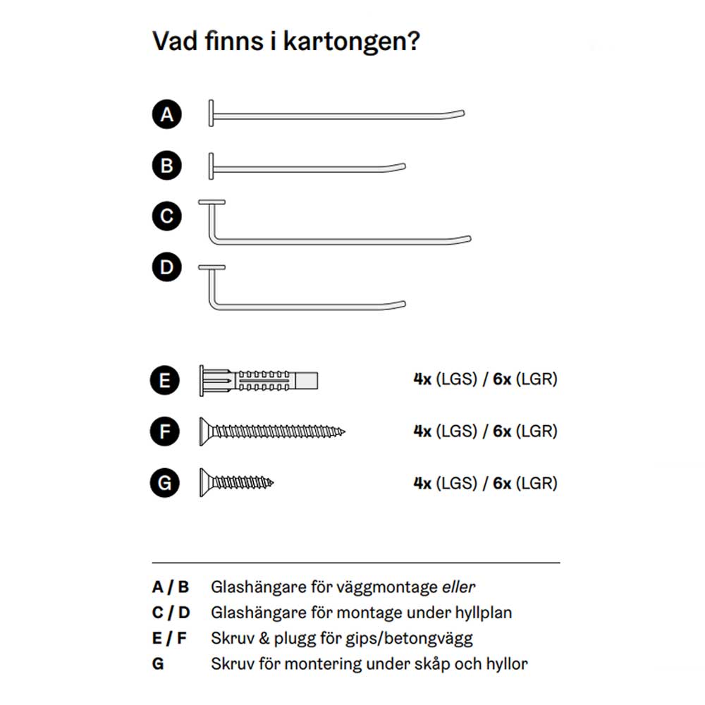 OBS! Monteringsanvisningarna ovan är anpassade för väggmonterade glashängare (A, B). För glashängare med montering under skåp och hyllor (C, D) följer samma anvisningar med undantag för steg 02 och 03. För dessa glashängare rekommenderar vi även skruvtyp G, som har en anpassad höjd och