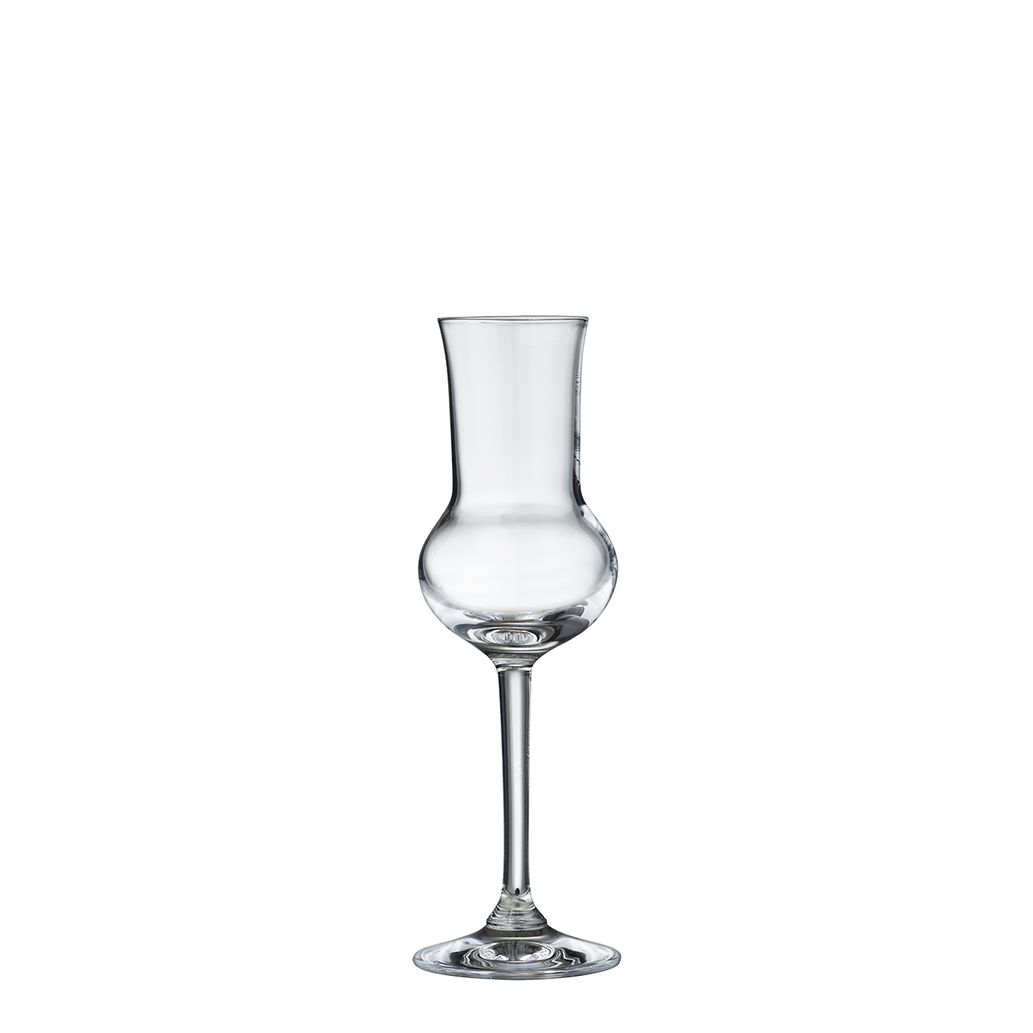 Klassiskt Italienskt grappaglas från Stölzle. Formen på grappaglas skiljer sig från övriga avecglas. Den övre delen av kupan är hög och rak medan den undre delen oftast är kulformad. Glaset har denna form för att grappan ska hamna långt bak på tungan när man dricker vilket, enligt somliga, förhöjer smakupplevelsen.