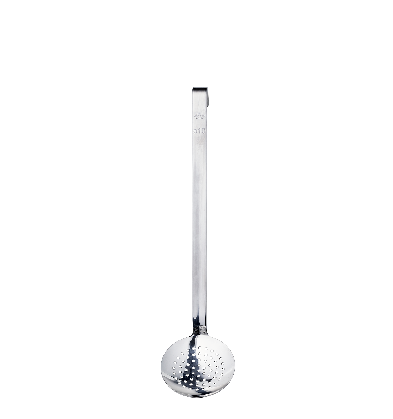 Hålslev eller skumslev i kraftigt utförande av rostfritt stål. Långt handtag som avslutas med en praktisk upphängningskrok. Diameter på den perforerade ytan är 1ocm. Tål maskindisk.