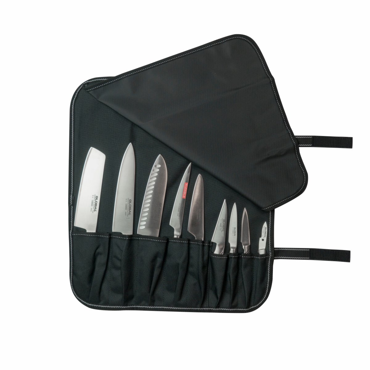 Globals knivväskor i nylon är både säkra för knivarna och smidiga att bära med sig. Den här modellen rymmer totalt nio knivar.