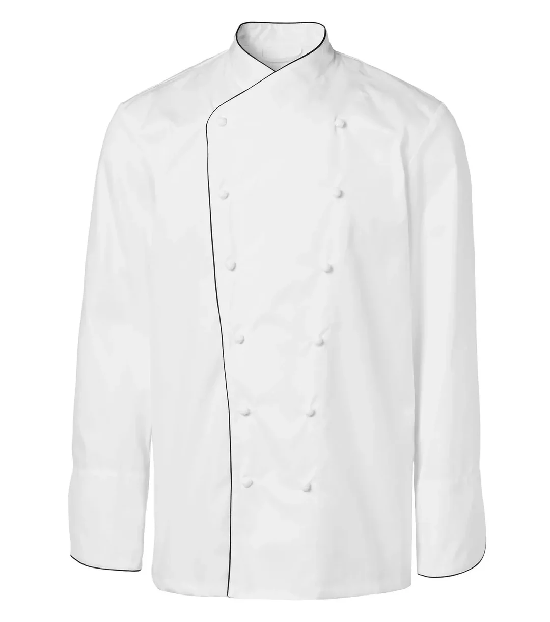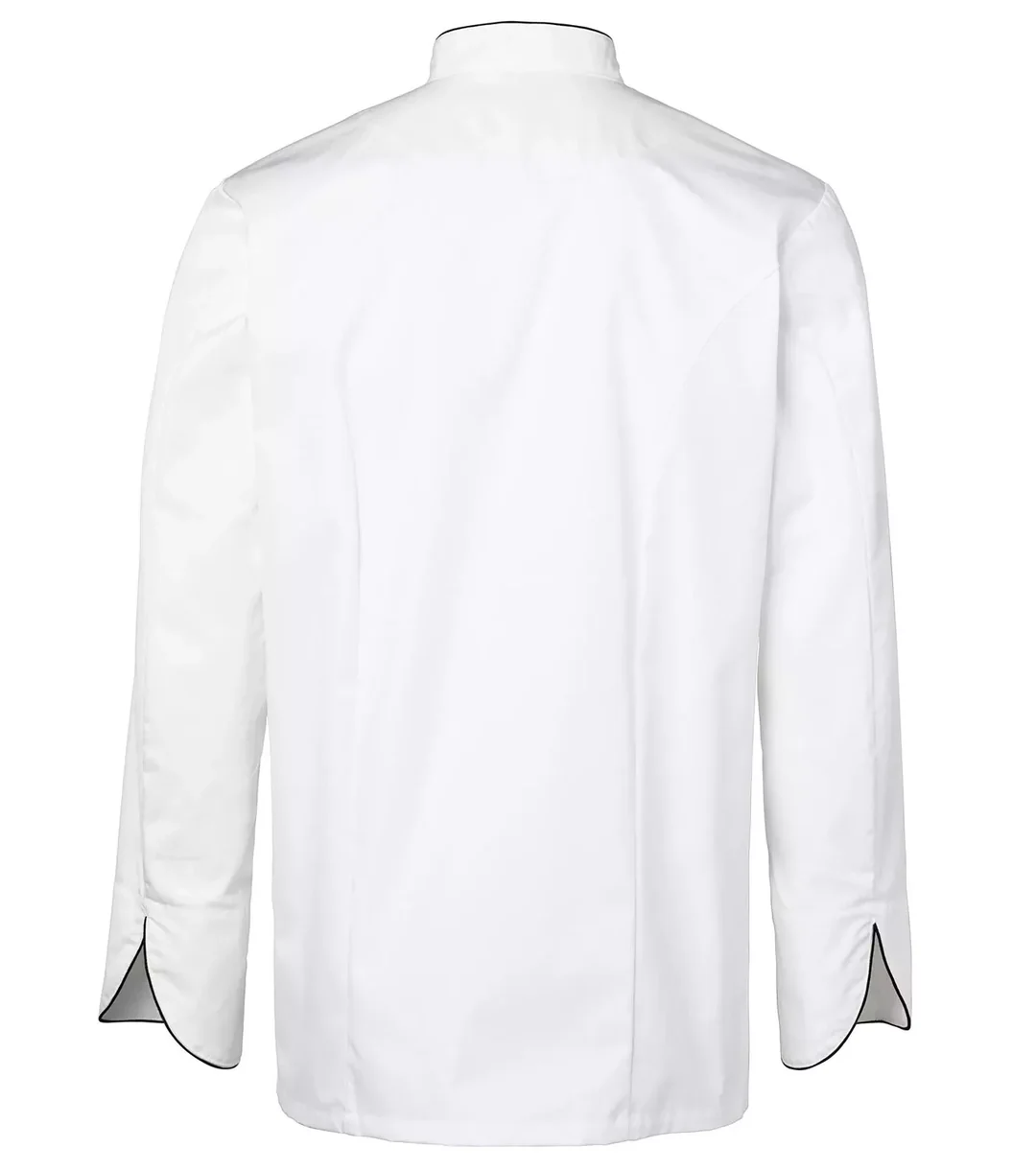 T1261Modern vit kockrock i herrmodell från Segers med fransk skärning och hank i nacken. Rakare modell med långa ärmar.