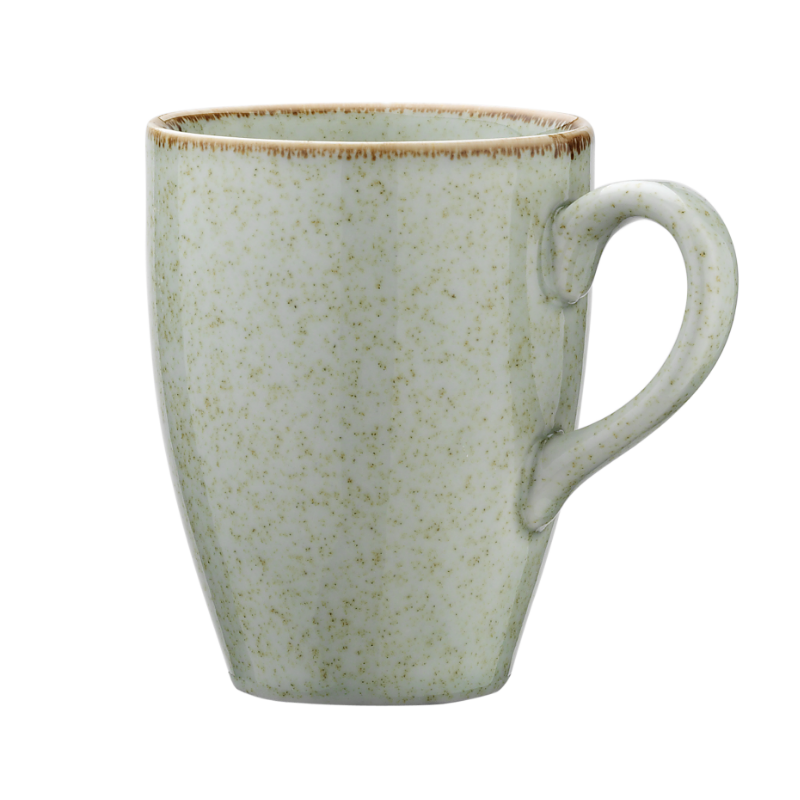 P8239Elegant mugg i varm ljusgrön färg och oregelbunden dekor som passar många slags kök. Stapelbar, tål mikrovågsugn, diskmaskin och frys.