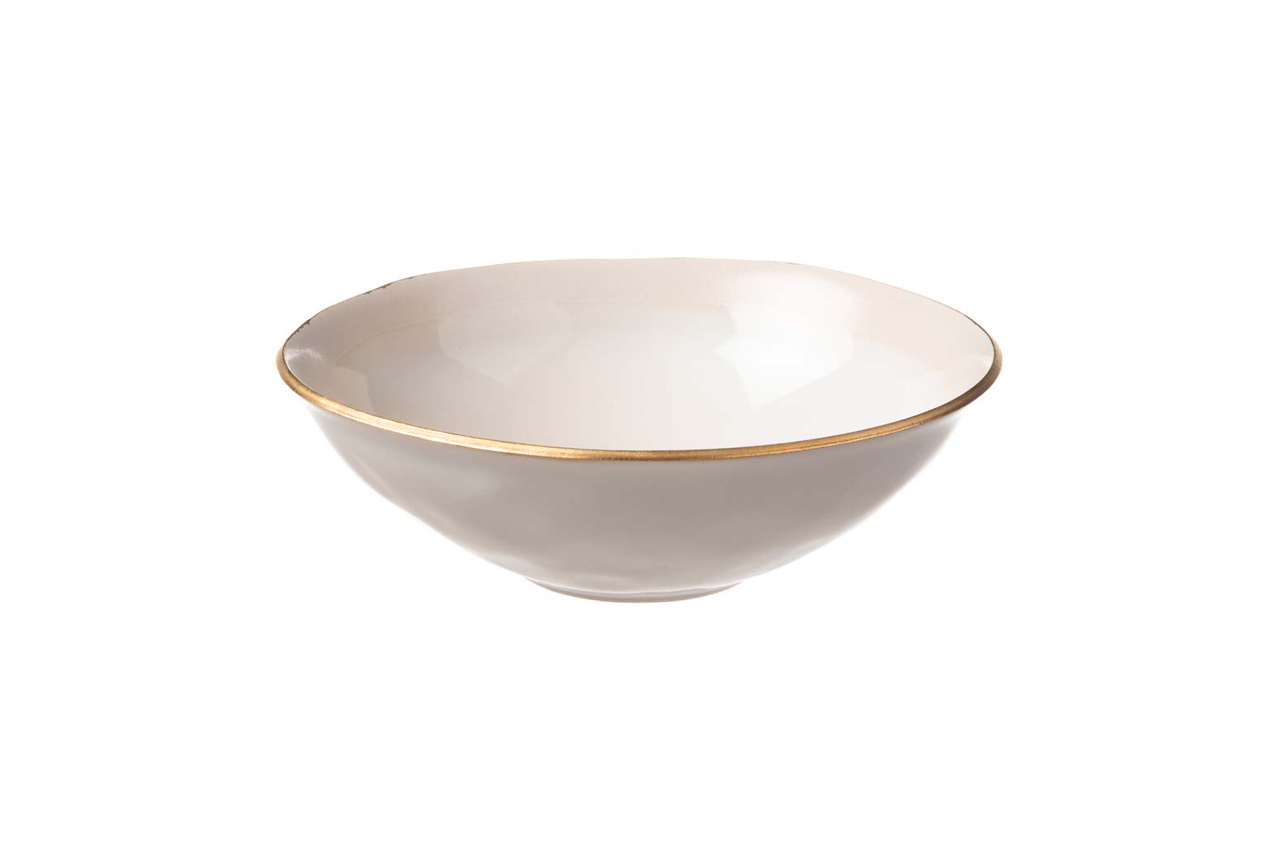 P9286Handgjord skål i stengods från Heirol och portugisiska Nosse Ceramics. Elfenbensvit med gyllene kant, inspirerad av japansk Wabi-Sabi. Perfekt för soppa, pasta eller frukost – varje skål är unik och hållbart tillverkad.