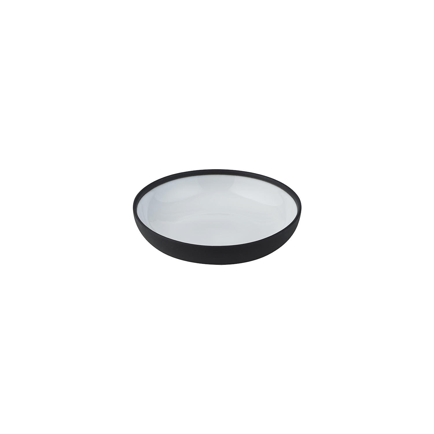 Djup tallrik i coupemodell från franska Revol. Tallriken har en svart oglaserad utsida och en insida i högblank vit glasyr. Detta är en stilren tallrik som passar många typer av maträtter och som förgyller din dukning.