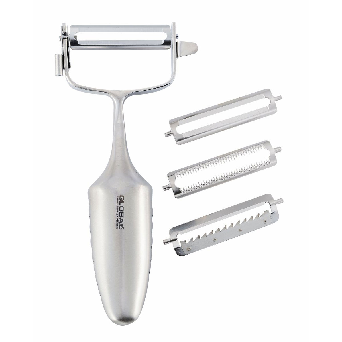 Sylvass skalare i T-modell med tre utbytbara blad från Global. Ett rakt blad för att skära frukt, grönt och rotfrukter med hårt skal. Ett tandat blad för mjukare skal och ett julienneblad för att skära grönsaksstavar.
