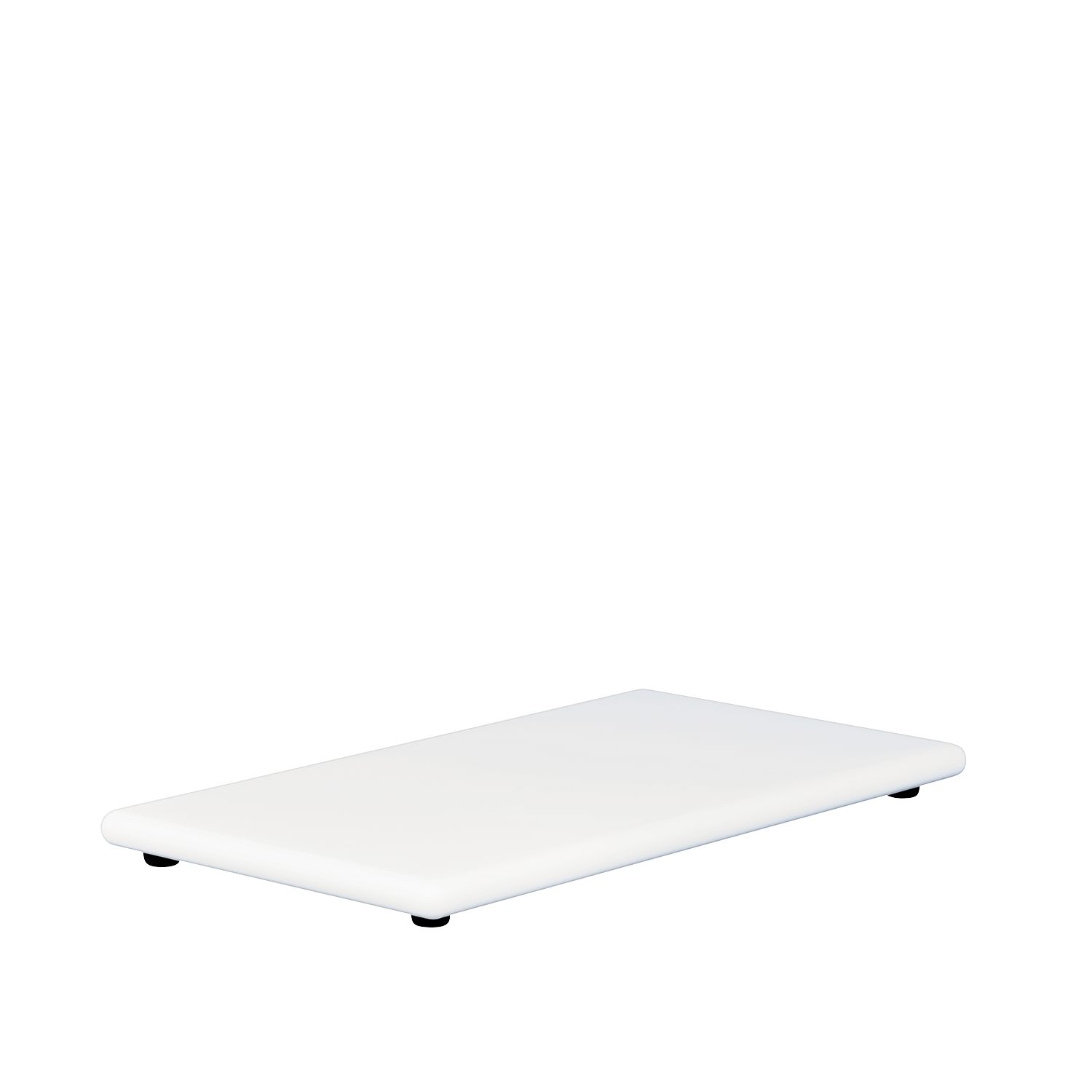 Skärbräda i hård hygienisk plast med gummifötter. Den tjocka plasten ger tyngd till skärbrädan och gummifötterna gör att skärbrädan står stilla på arbetsbänken.