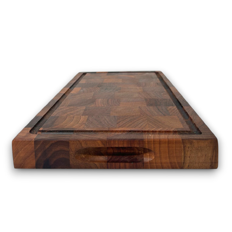 K4028Hållbar skärbräda i massiv välnot med ändträskant. Mått: 450x250x40 mm. Skonsam mot knivar.