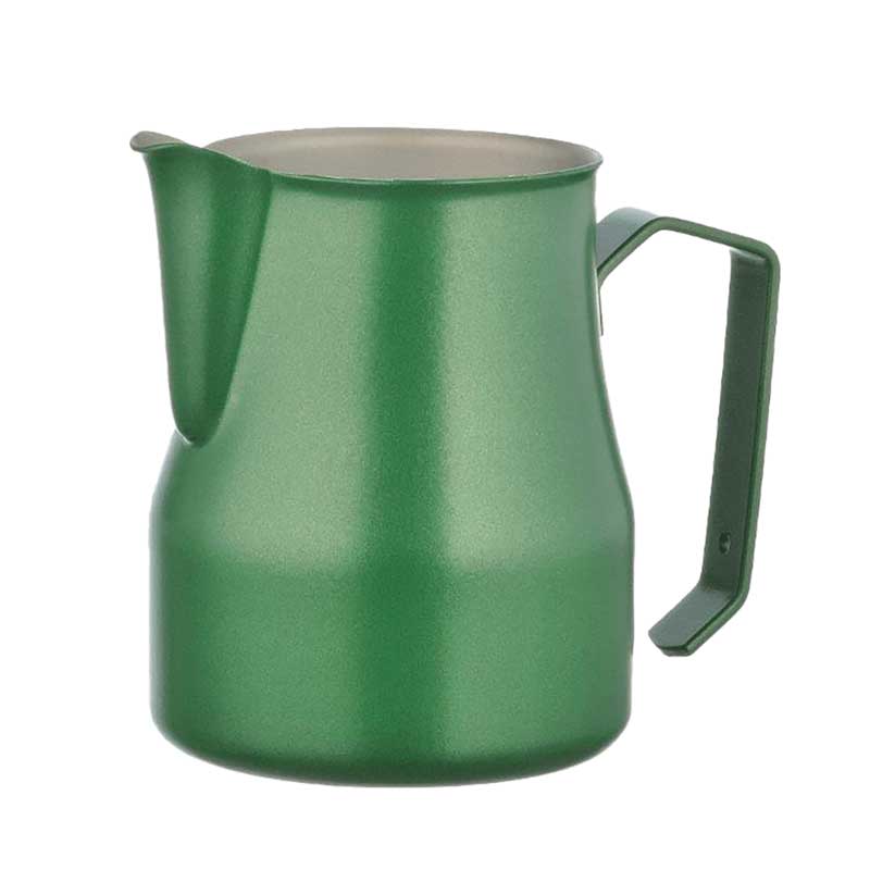 Skumkanna Grön 35 cl från italienska Metallurgica Motta i modern italiensk design i rostfritt stål av högsta kvalitet. Rymmer 35 cl vilket passar utmärkt till en take-away cappuccino.