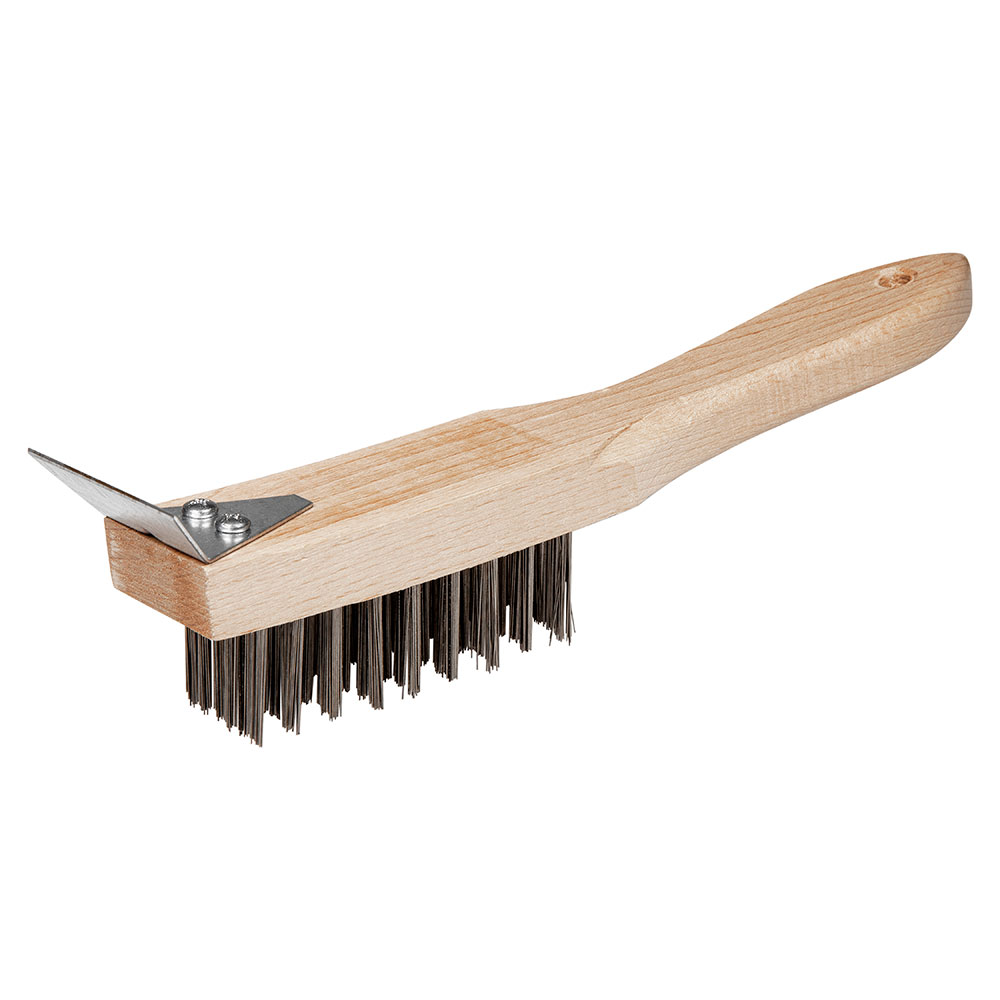Stålborste med skrapa med ett bekvämt handtag i trä. Ett lätthanterligt och smidigt verktyg som passar utmärkt som ett rengöringsverktyg i köket.