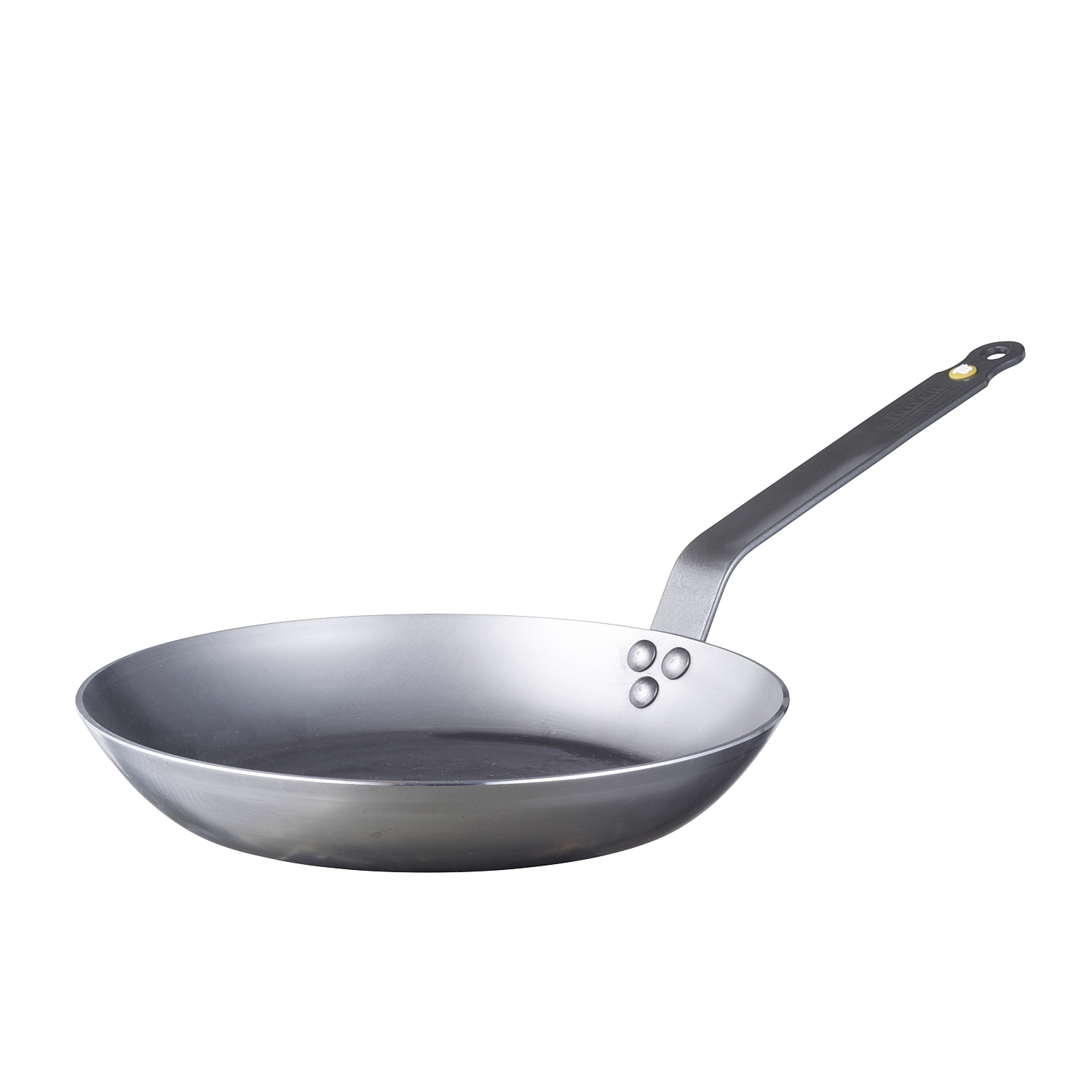 Vill du ha en stekpanna i naturligt material fri från syntetisk non-stick beläggning ska du välja en kolstålspanna. De tål att hettas upp ordentligt vilket är en förutsättning för att få till den rätta ytan på stekt kött. Stekpannan fungerar också bra till potatis, pannkakor och omelett. En kolstålspanna måste stekas in. Desto mer den används ju mörkare blir den, ytan mättas och kolstålet får en naturlig non-stick egenskap. De Buyer Mineral fungerar på alla spishällar. De ska diskas för hand och därefter torkas torra. Kolstål rostar om de ligger blöta länge och de får aldrig diskas i maskin.