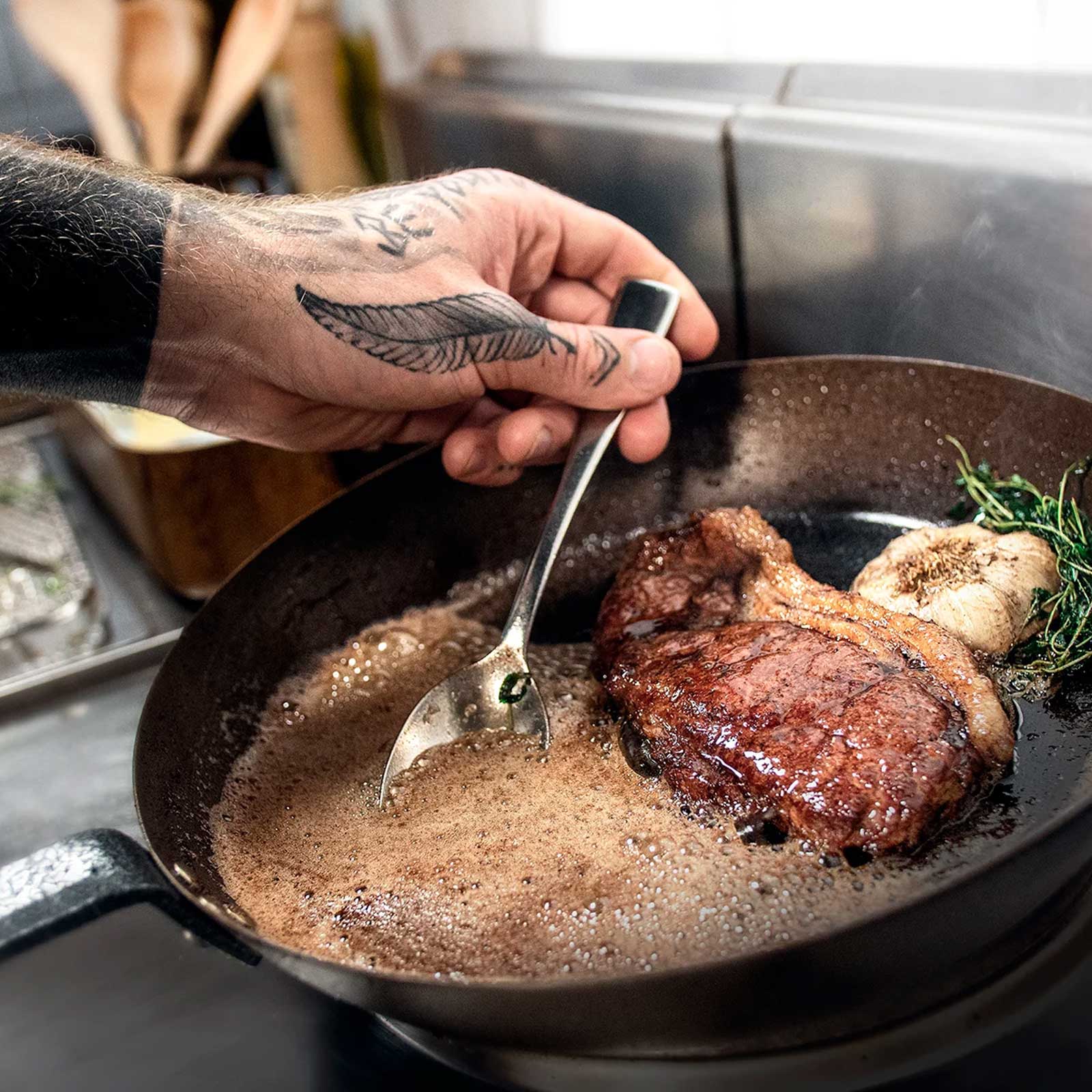 Stilren stekpanna Ø 24 cm 1,8 L i kolstål med bivax beläggning som skapar den perfekta balansen mellan hållbarhet och lätthet. Pannans handtag är tillverkat av järn med värmetålig beläggning. Stekpannan fungerar på alla värmekällor, inklusive induktion och ugn upp till 230°C.