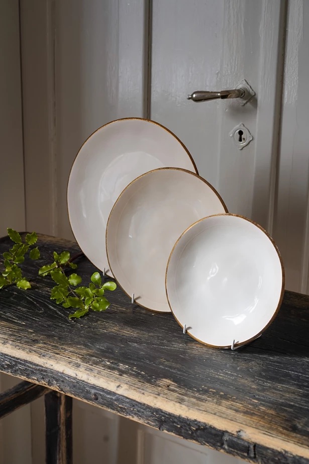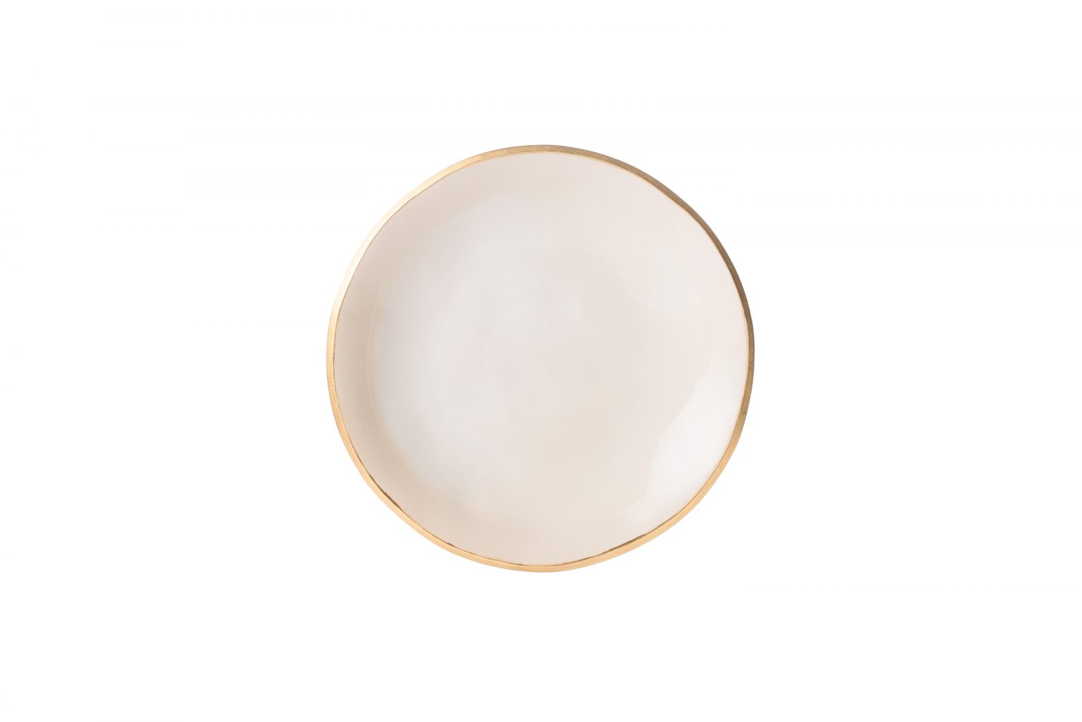 P9281Handgjord tallrik i stengods från Heirol och Nosse Ceramics. Elfenbensvit med gyllene kant, inspirerad av japansk Wabi-Sabi. Perfekt som frukost- eller sidotallrik – varje del är unik och hållbart tillverkad.