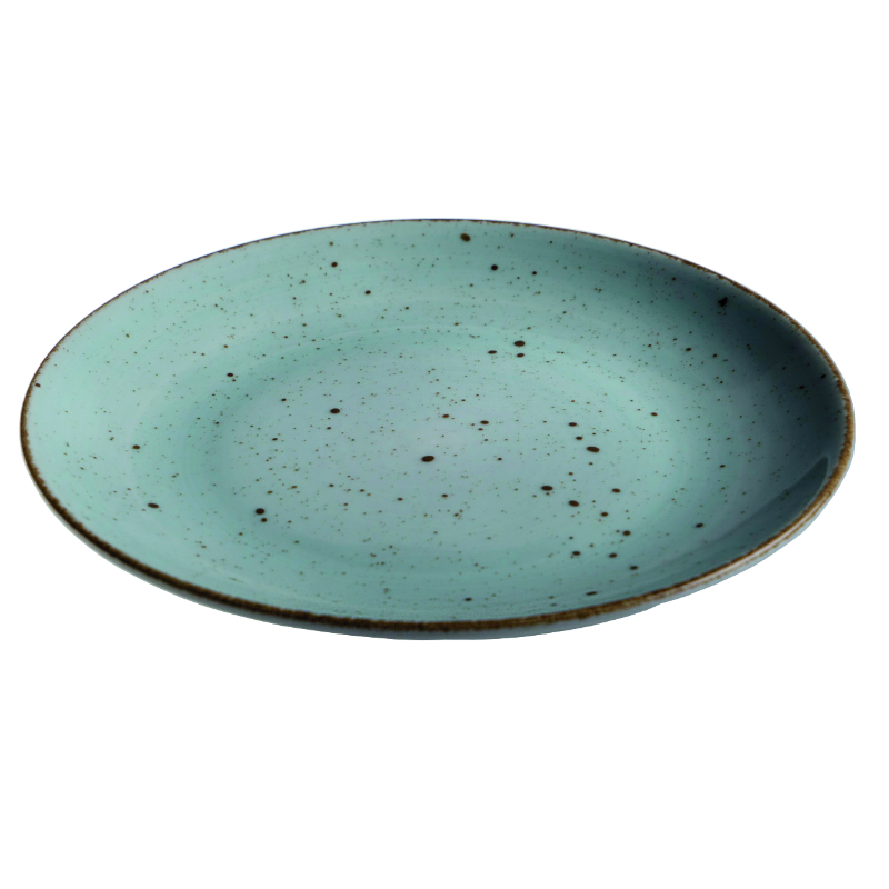 Handmålad förrätts/desserttallrik i turkost med bruna prickar. Stapelbar, tål mikrovågsugn, diskmaskin och frys.