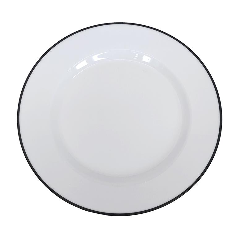 Förrätts/desserttallrik med svart rand. Stapelbar, tål mikrovågsugn, diskmaskin och frys.