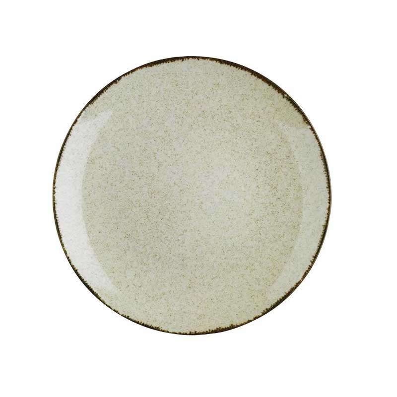 P8242En fin tallrik utan bräm med varm beige färg och oregelbunden dekor som passar många slags kök.