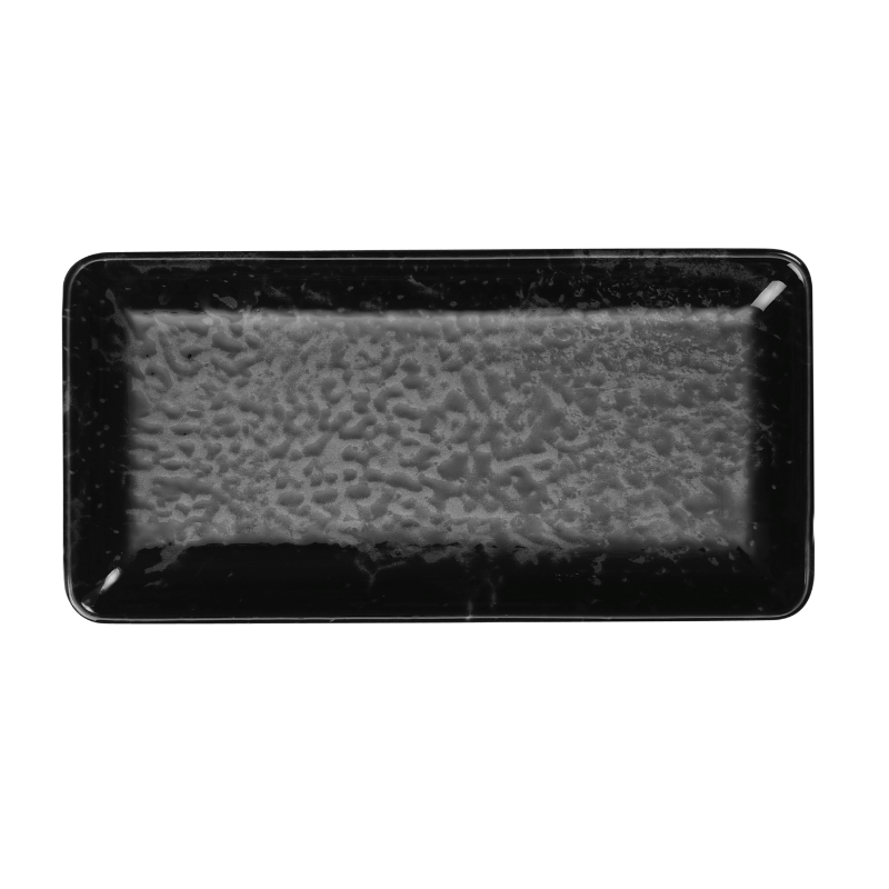 Rektangulär tallrik i svart med mörkgrått inslag i dekoren som ger ett elegant intryck. Stapelbar, tål mikrovågsugn, diskmaskin och frys.