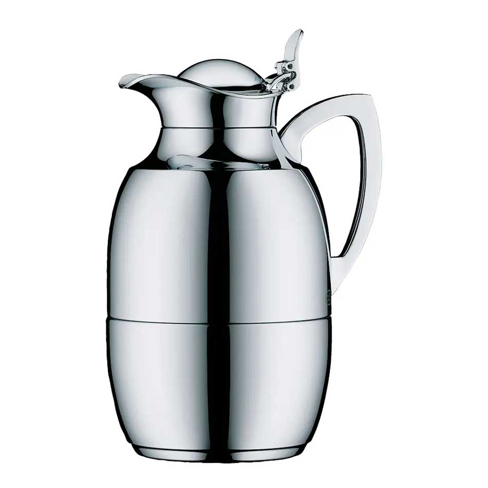 Alfi Juwel är en av världens mest kända termoskannor, och den ursprungliga stilrena designen går så långt tillbaka som 1918. Termos i polerat stål av hög kvalitet. Dubbelväggig AlfiDur-insats i isolerande och härdat vakuumglas. Håller värmen i 12 timmar, håller kylan i 24 timmar. Unikt och praktisk hällsystem. Kan användas med en hand. Ergonomiskt, förkromat metallhandtag.